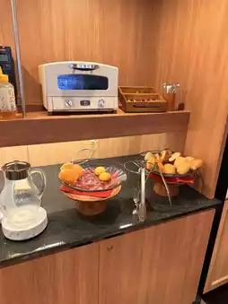 The bathroom is small, with a bidet and a compact integrated bathtub, but there is actually a large bathing area where you can take a comfortable hot bath before going to bed at night. Although this bathing area only has three flushing positions, it is used alternately by men and women, from 18:00 to 19:50 for men and from 22:00 to 07:50 for women. Women: 15:00-17:50; 20:00-21:50; 08:00-09:30. The room is luxuriously equipped with a 50-inch TV where you can watch YouTube and Netflix.