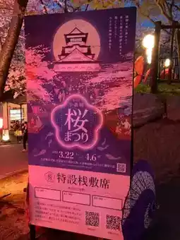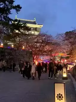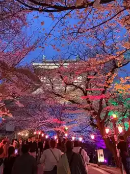 Kokura Castle at night exudes a solemn tranquility under the glow of lights. Cherry blossoms quietly bloom, their delicate petals drifting in the breeze, creating a dreamlike atmosphere. As you wander through, the ancient castle and night cherry blossoms intertwine into a picturesque scene. A gentle breeze brushes by, and the air is filled with a faint floral fragrance, accompanied only by the sound of footsteps. In this moment, the surroundings seem to quiet down, and time flows slowly. The view before you carries the weight of history while showcasing the gentle beauty of nature, immersing you in a sense of peace and a blend of thoughts.