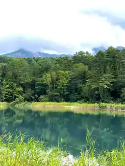 It's the second largest of the Goshikinuma Ponds, reflecting sunlight beautifully and shining brightly. Unfortunately, it was the height of the rain, so we couldn't see the Agatsuma Mountains in the distance.