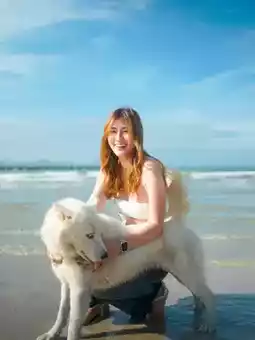 Let's go kite flying in Rayong. It's near Laem Mae Phim. It's a very peaceful beach with strong winds, perfect for kite flying. There were also dogs that came out to greet us and let us play in the wind. We were lucky to meet them because they were very friendly and kept jumping around.