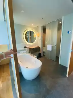 There is a bathtub in the room and a sitting area to enjoy the view outside