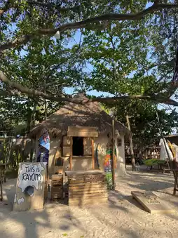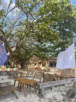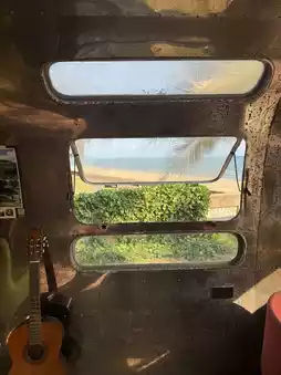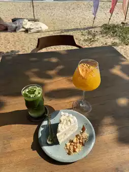 The menu offers a wide variety of choices, including main dishes, snacks, beverages, and a complete selection of bakery items. The cafe is spacious with multiple seating zones to choose from, such as the bar area, camper van zone, and beachfront zone. There are plenty of picturesque spots for photography, especially around the camper van area 📷.