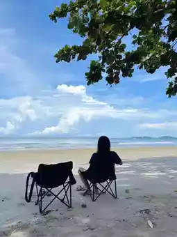 Take the kids to Laem Mae Phim Beach, sit and relax by the sea, play sand, play water, play football, have fun. Sit for hours. There are big trees to provide shade. The cool breeze blows. We can talk happily. We brought picnic chairs in the back of the car, so we can take them out and sit. There are no canvas beds like other beaches. But we like it because it's not crowded.