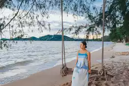 Tranquil Environment: Featuring a private beach area with swings, walking paths, and serene sunset views.