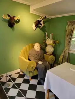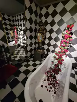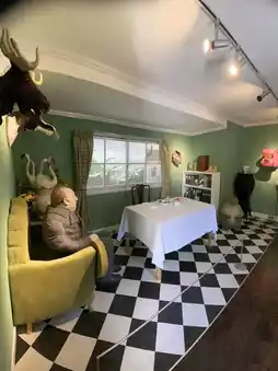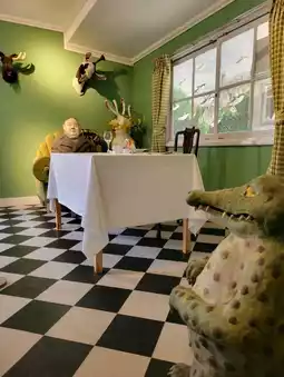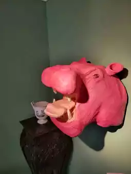 Peeking out from the emerald green walls are trophies of pink hippos, zebra-striped pigs, and Holstein-striped giraffes. On the chessboard-like floor, a fat crocodile with a troubled face stands on two legs. Is the gentleman who looks depressed, clinging to a giant bee, the owner of this room? There's a little pig in the soup bowl, and penguins flying in the sky outside the window... the more you look, the more you feel like you've entered a dream 🃏🤡🎈🦛