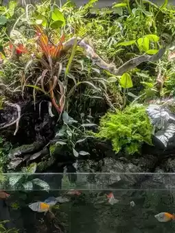 I love the theme of the tortoise walking area, which I introduced in the photo. This aquarium has the largest poison dart frog exhibit in the Kinki region, and I love how dynamic the Nature Aquarium in this area is.