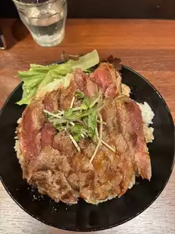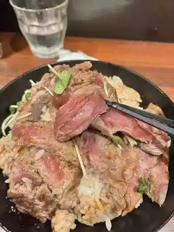 The generous portion of medium-rare cooked meat completely covers the rice. ✨