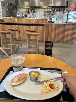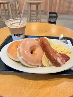 This time, I opted for the morning plate 🍳🥓. It features a fluffy donut, juicy sausage, scrambled eggs, and even some fruit. The vibrant presentation lifts your spirits right from the start of the day!