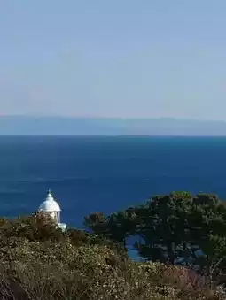 A stunning scenic spot where the green of the pine trees and the deep blue sea blend together in harmony