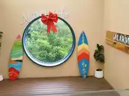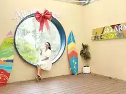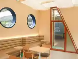 ☕ Alarm cafe Kohchang The shop is located on the second floor of Nong Bua Seafood restaurant. When you walk up, you will see a corner for taking pictures and checking in with a cool round mirror. The shop is airy and spacious. The walls of the shop are made of glass, allowing you to see the outside from the second floor. 🔅🐬
