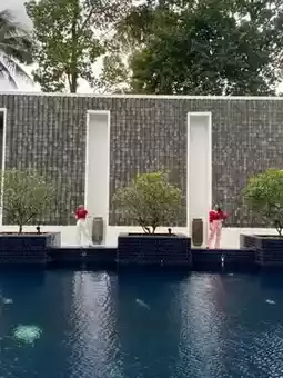 👗 Red dress, taking pictures with the pool and building scenes, giving a feeling like being in Bali! 🤭