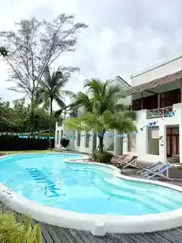 Just stepping in, you feel like you're really relaxing because the atmosphere is super chill. Decorated in white and blue tones, bright and perfect for the sea. The swimming pool is in the middle of the accommodation. You can swim or sit by the pool. There are many cute photo spots. 📸