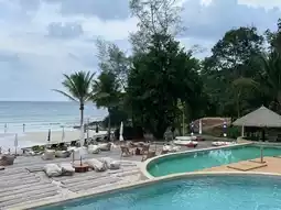 The Deck Bar is located in Koh Kood Resort. It's a relaxing beachside spot with a spacious area and plenty of seating. Food and drinks are available. There's also a beautiful photo spot with a long bridge extending into the sea, perfect for photography enthusiasts.