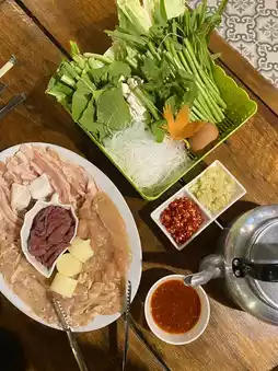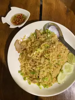 Today, I chose the charcoal-grilled pork. There's a small set for 380 baht and a large set for 500 baht. There's pork, chicken, and seafood. I chose the small set (no seafood). It's so much food that two of us barely finished it. The sauce was delicious. I thought the pork barbecue on the island couldn't compete with the city, but it was absolutely delicious. I added a plate of pork fried rice, which was incredibly delicious and filling.