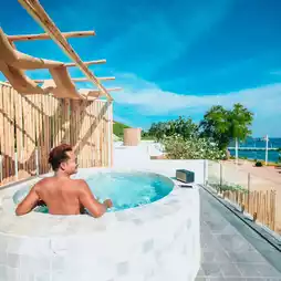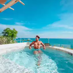 Check out the Atlantic Blue room, a newly designed minimalist-style villa with breathtaking 180-degree sea views. It features a rooftop and a jacuzzi, perfect for relaxing while enjoying the scenery. The room is fully equipped, including a speaker for your convenience. Note that there are only three of these exclusive villas available, and every corner of the room is Instagram-worthy!