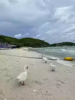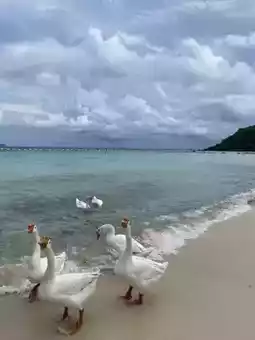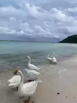 This is a very beautiful beach. It's clean, shady, and the water is crystal clear and inviting. And, most importantly, there's a celebrity on the beach: baby geese playing in the water. You can see them swimming! But be sure to arrive early, as they usually come out in the morning. After 9 a.m., the staff will take them back to their accommodations. A great family getaway for the holidays! 🌊🏝️🏖️🦢