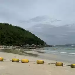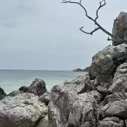 (Ta Yai Beach) on Koh Larn is a small, peaceful beach with crystal-clear water and plenty of photo opportunities. The highlight is the crystal-clear water, a gradient of blue. The rocky shoreline offers many chic photo opportunities, creating a tranquil atmosphere, almost like a private beach. With few tourists, especially Thais, it's perfect for those seeking relaxation. Morning light before 8 a.m. is ideal for photography, as the sun isn't too harsh. There are only a few small restaurants on the beach, and some beach chairs are available for rent, but not as numerous as on other main beaches.