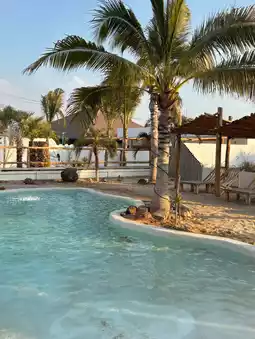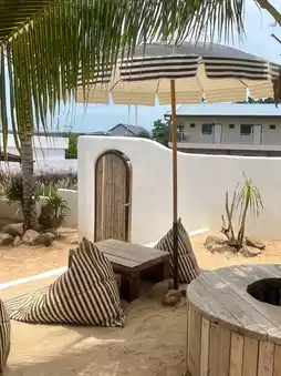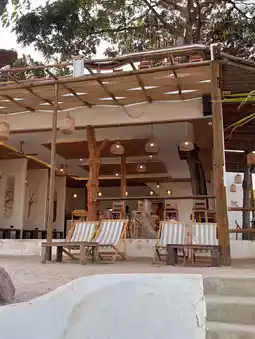 Beach style cafe with a super cute atmosphere and a pig running around.