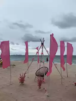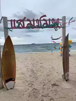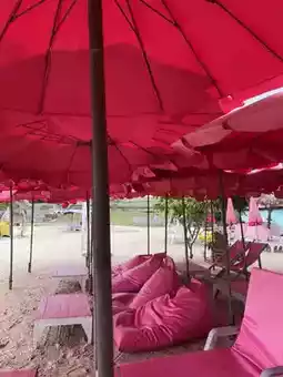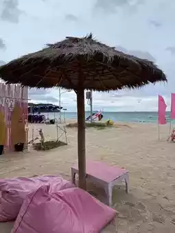 When I came to Samae Beach, I couldn't resist sitting and enjoying the sea view. But I ended up finding the cutest place to sit! The entire restaurant is pink! It's so adorable! This place is right next to the stingray project. Walk all the way to the end of Samae Beach and you'll be drawn to the shop, as it's completely pink. We went and they had a special offer: if you order one dish per person, you can sit on the bed without paying the extra fee. If you don't order, you have to pay 100 baht per person. Personally, I think ordering food to go with the meal is a better deal. It's only a few baht more and you get to eat something extra. It's a great deal! ๐ซถ๐ป๐ท๐๐๐