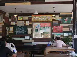🛟 The restaurant's retro decor features vintage brand logos on the walls and dark brown wooden tables, reminiscing about the past.