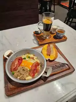 Most importantly, you'll find two adorable, chubby little piglets. The cafe serves drinks, desserts, and savory dishes.
