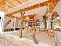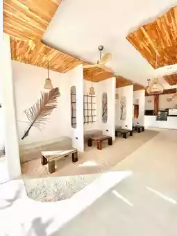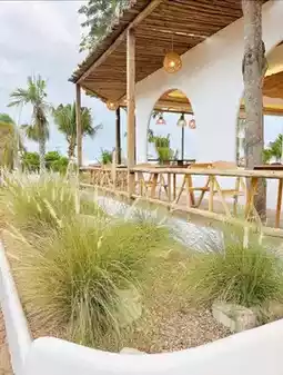 This cute cafe features a minimalist Balinese-inspired décor, accented by white tones and wood accents. The two-story cafe features sand on the walkways and cafe area, reminiscent of walking on the beach.