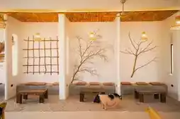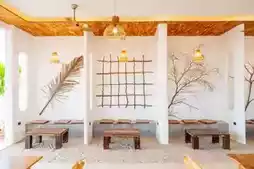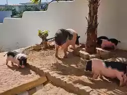 Kamari Cafe is a summer beach-style cafe and rooftop bar featuring two mischievous little piglets.