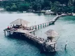 being located at the end of a wooden bridge that extends into the sea