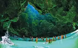 From Kuan Tung Ku Pier, it takes approximately 30 minutes to reach Koh Muk. Regular and chartered ferry services are available. Located on the western side of Koh Muk, visitors must float in groups from the cave entrance through the darkness for 80 meters.