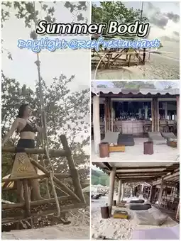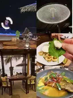 There is a beautiful drinking area with good lighting for taking pictures or enjoying the atmosphere. The beach is a relaxing place to eat with a fire show from the restaurant. There are also waiters who provide warm and friendly service, recommend menus, and take care of us politely.