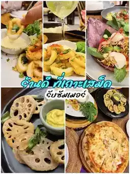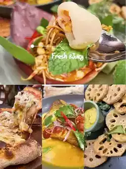 Appetizers ✨ Banana blossom salad (full of fresh vegetables, with lychees to cut the sour and sweet taste and enhance the aroma of each bite to create a variety of flavors in one bite) ✨ Crispy lotus root with curry sauce (chewy and soft lotus root) ✨ Calamari squid ✨ Red curry with sea bass (refreshing with fruits such as grapes and fresh vegetables) ✨ Bruschetta garlic bread ✨ Pizza, freshly baked seafood