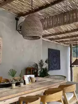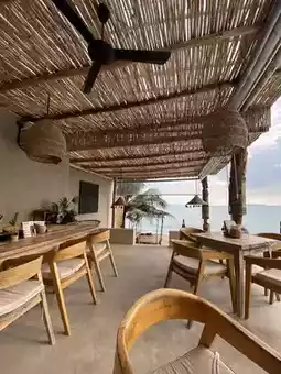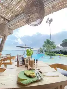 That morning, we woke up early to go jogging along the beach of Koh Samui. The air was fresh and the sea breeze was blowing gently. It felt great before stopping by to chill at the hotel's cafe. The atmosphere was quiet and decorated with Balinese-style woodwork, looking warm and natural.