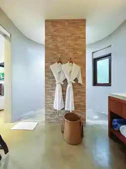 After checking in at the reception, a bamboo-lined path leads to the villas nestled in lush greenery. Stepping inside, you’ll find an outdoor terrace and a private pool where you can immerse yourself in nature. The villas adopt an open-concept design, with floor-to-ceiling glass doors and private terraces extending the living space outdoors. The rooms blend contemporary Thai elements with purposeful simplicity, featuring custom furniture, Thai-style ceiling fans, and oceanic decor for a relaxed ambiance.