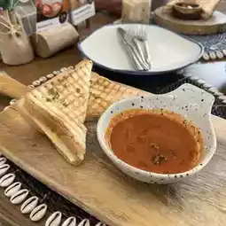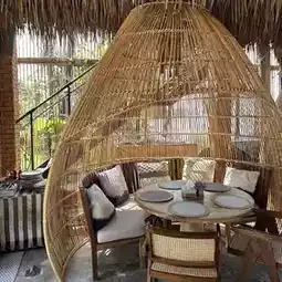 • Decorated in a Bali beach style 🌺 with natural wooden tones and soft cushions for chilling on the sand.