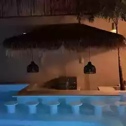 • Outdoor bathtub / rain shower, home spa feel. 🛁