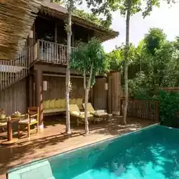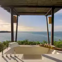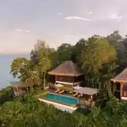Secluded cliffside villas with private infinity pools and panoramic views. Eco-friendly design, spa, wellness programs, library lounge.