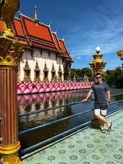 Just down the road is Wat Plai Laem, and this one is pure eye candy, colorful, detailed, and floating on a lake. There’s a big 18-armed Guanyin statue and a chubby laughing Buddha that’s honestly kind of adorable. The vibes are super zen, and you might even catch a monk chanting if the timing’s right.