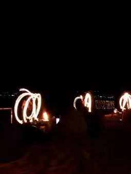 At 7:30 PM, the fire show began with thrilling music. Several performers came out with various fire props: