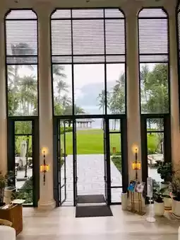 Clean, beautifully designed, spacious, and airy, with natural light blending harmoniously from the sky, water surfaces, and grassy fields. Tall circular columns reaching the sky create a majestic atmosphere reminiscent of a cathedral. Nearby, you can see a Thai pavilion and turquoise sea.