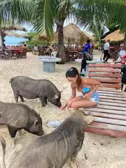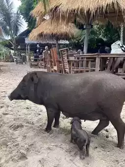 We opted for a half-day tour to Koh Pig, and the nearby snorkeling spot is Koh Tan. It's about a 30-minute boat ride from Koh Samui, and there's a 50 baht per person entrance fee. There's a restaurant on the island, though the price can be a bit steep. They also offer food for the pigs for 50 baht per bag. There are plenty of places to sit and relax, swim, and take photos.