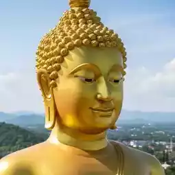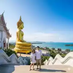 The view from above reveals the golden Buddha statue standing out against the sky, surrounded by Thai motifs and a Naga staircase leading to the summit. Behind you is the view of Bophut Beach, which curves into the clear blue sea, reflecting the beautiful morning sunlight. This is a peaceful and powerful viewpoint, perfect for sitting quietly, enjoying the sea breeze, and recharging your spirit.