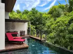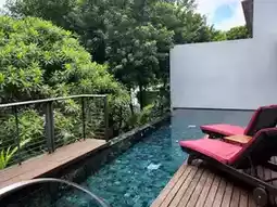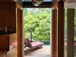 The private pool in the room is a highlight for me. It feels longer than usual, making it comfortable for swimming laps. The pool depth is just right, and most importantly, it is very clean and surrounded by lush greenery. The room also includes a large daybed, perfect for lounging and relaxing.