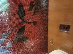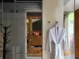 The bedroom boasts high ceilings and a spacious layout. The bathroom is equally impressive, with an outdoor shower area and a large bathtub in the center of the room that can accommodate two people, complete with a small TV for entertainment. The toilet includes a standard bidet spray. Some older reviews mentioned the absence of this feature in certain rooms, so it might have been added recently.