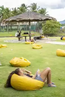 The outdoor waiting area is even more enchanting. Swings, bean bag chairs, large lawns... every corner seems to invite you to pause. My favorite spot is sitting on the sofa under a tree, ordering a cold drink, and watching planes slowly take off and land above the coconut trees. At that moment, waiting is no longer a torment but another enjoyable part of the journey.