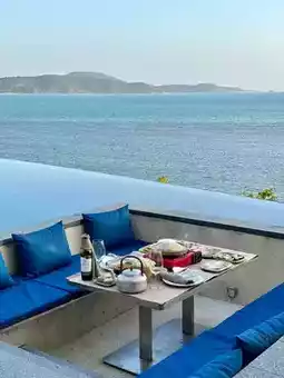 Atmosphere: Beyond words! Sitting by a private infinity pool, enjoying the sea view, cool breeze, and a breathtaking sunset. It's a romantic and utterly delightful barbecue experience.