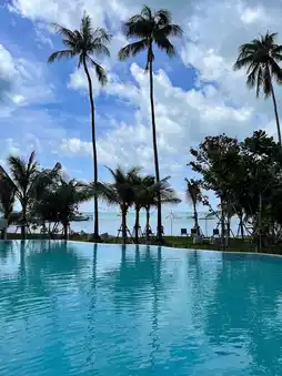 The hotel features a large beachfront swimming pool, which is a stunning spot for photos.