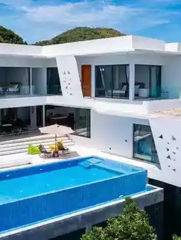 🏡 Modern white villa with an infinity pool overlooking the sea.