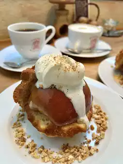 The kurmido cake tastes like a muffin and is topped with baked apples and cream.🍎