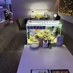 The fish tanks are lined up in a small space, making it look like an aquarium.