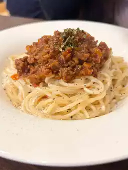 The meat sauce pasta was a first for us—it featured pasta coated in creamy sauce topped with meat sauce 🤔. My daughter was thrilled with how tasty it was ◎